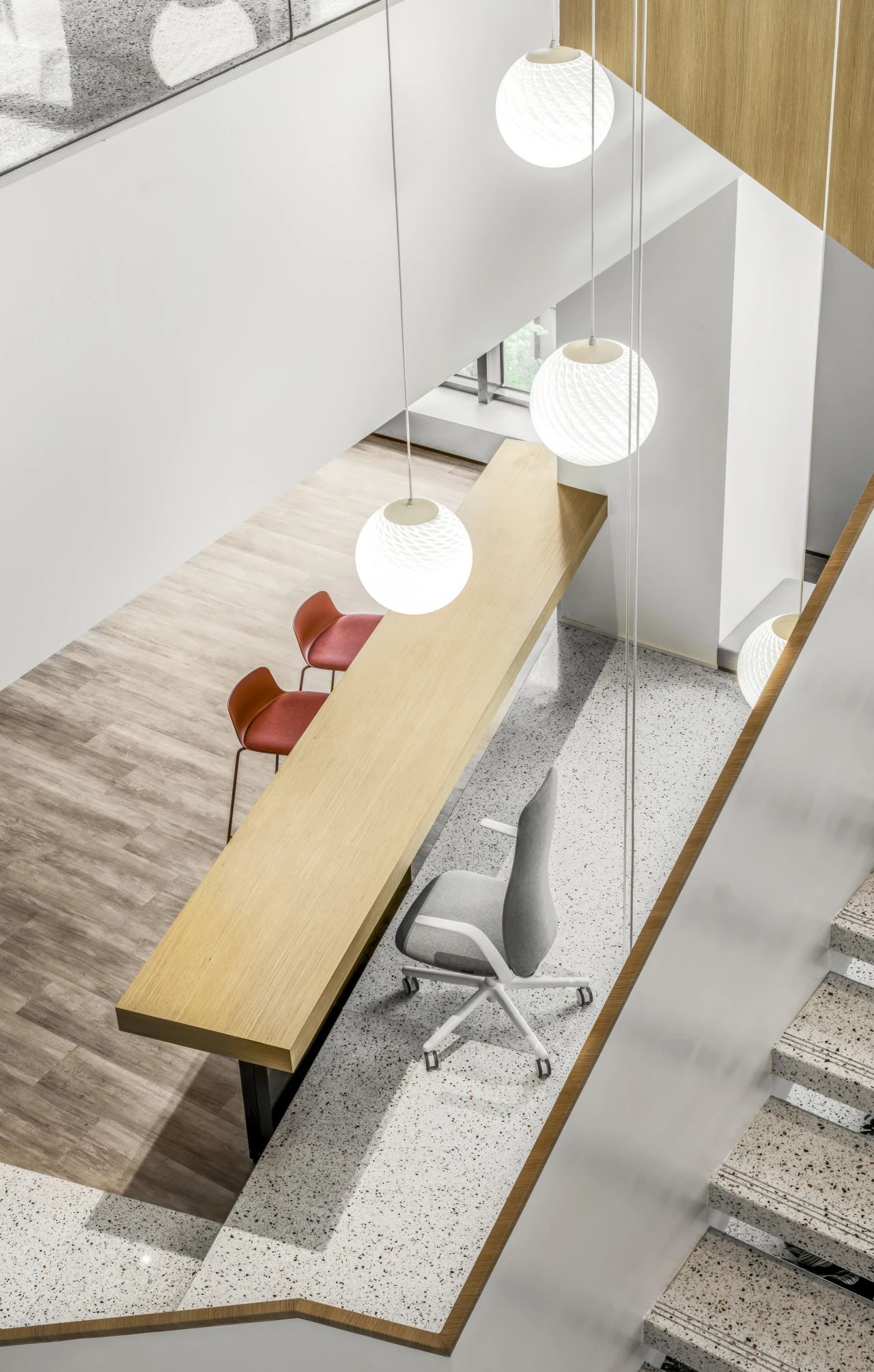 The original layout was flat and uniform—functional but uninspired. The design team responded by injecting movement, elevation, and flow into the space. A central staircase now acts as a sculptural connector, visually dividing zones while enhancing physical accessibility between floors. Team clusters were restructured around natural circulation paths, while shared areas such as lounges, bar seating, and open meeting pods were strategically layered between zones to promote spontaneous interaction.