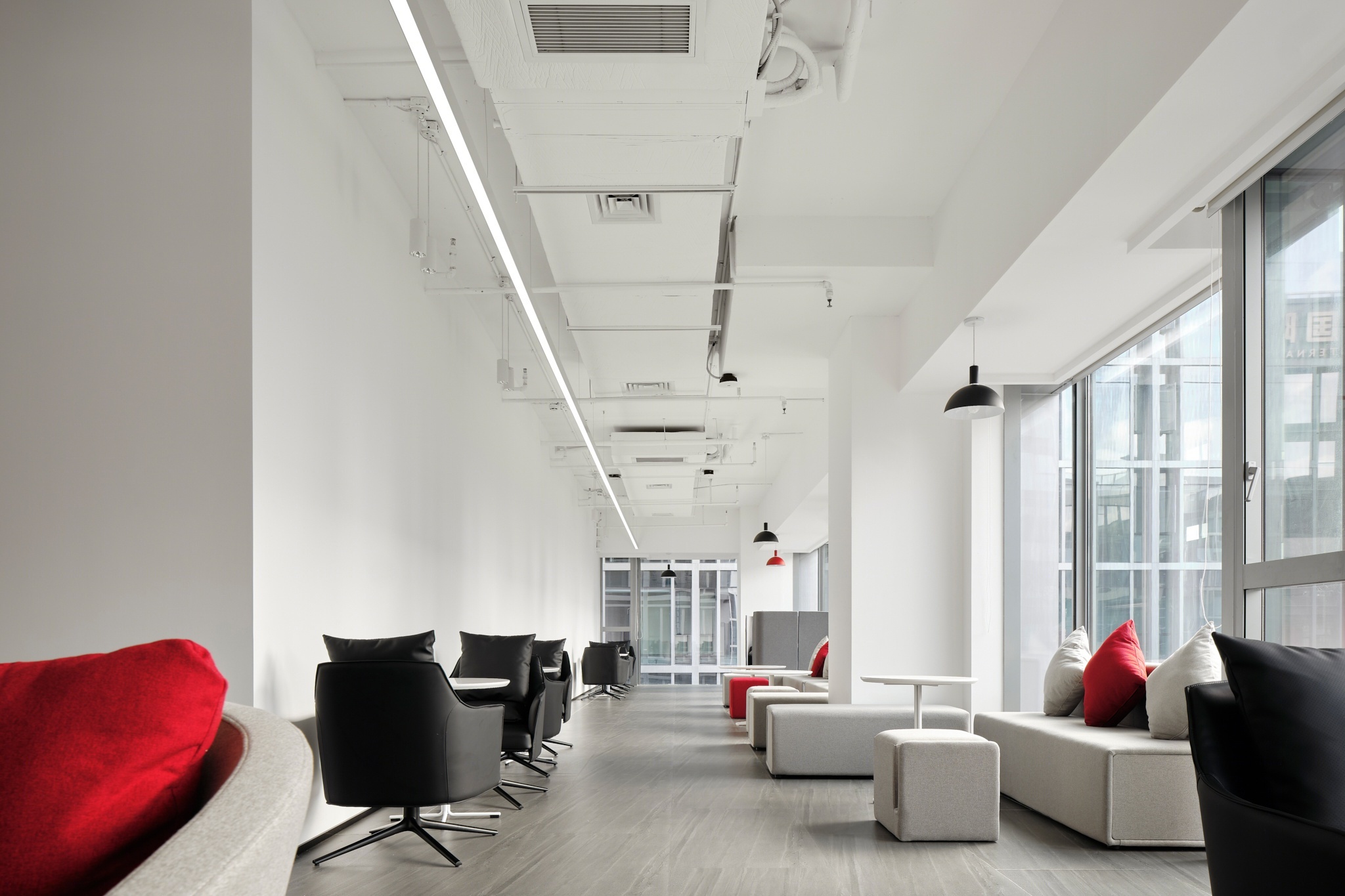 A controlled material palette emphasizes contrast, softness, and structure. Warm neutral surfaces—matte plaster walls, wood-effect flooring, and seamless acoustic ceiling treatments—form the canvas. Against this backdrop, bold black and red accent elements punctuate the space: custom pendant lamps, circular seating cushions, and angular task lighting introduce moments of intensity that activate the calm.